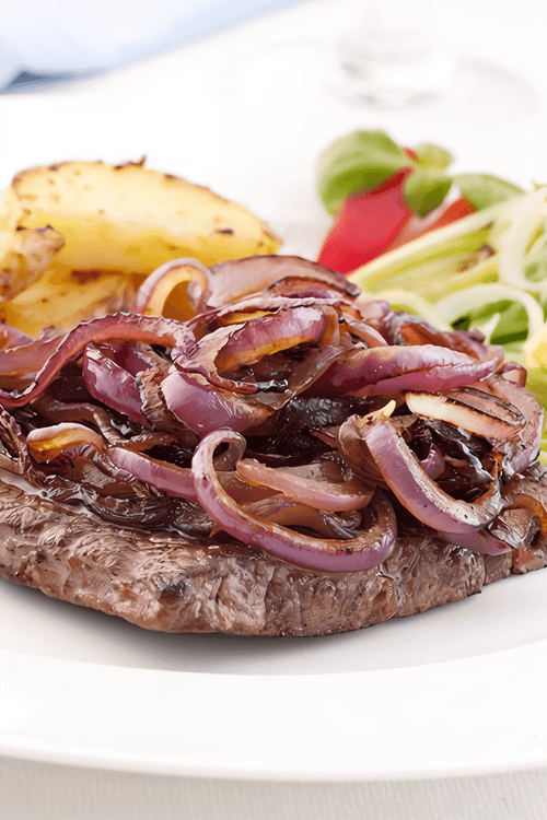 Pickled onion appetizer for meat is a true decoration of the Russian table. Simple yet refined, it highlights the richness of meat dishes' flavors, creating a harmonious blend of sweetness, slight acidity, and spicy zest. Thin slices of red and sweet onion soaked in ice water to remove bitterness are infused with the aroma of wine vinegar, sugary tenderness, and salty depth. Fresh green onions and black pepper complete the composition, adding freshness and brightness. This pickled onion pairs perfectly with shashlik, roast meat or steak, revealing the fullness of their flavor nuances. It is a classic of Russian cuisine that conveys the traditions of family meals and cozy home gatherings.