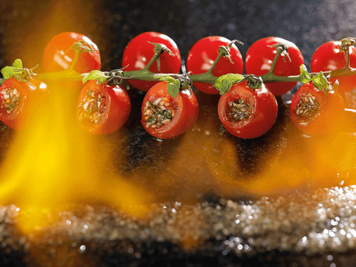 This exquisite author's recipe is a harmony of freshness and rich aromas. Cherry tomatoes stuffed with a spicy filling of lime, garlic, mint, chili pepper, and leek gain an extraordinary taste thanks to the combination of soy sauce, honey, and balsamic cream. The light acidity of lime, sweetness of honey, and depth of balsamic cream create a perfect balance. The originality of serving on a strip of stone salt soaked in cognac and ignited makes the dish not only a gastronomic delight but also visually striking. It is a wonderful appetizer option suitable for a festive dinner or romantic evening, impressing with its refined taste and aesthetics.