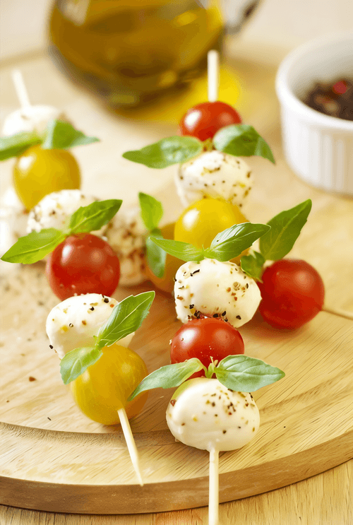Canapés with colorful cherry tomatoes, mozzarella balls, and basil are a true embodiment of Italian elegance and flavor harmony. This light and sophisticated snack masterpiece has its roots in traditional Mediterranean cuisine, where the freshness of ingredients plays a key role. Sweet cherry tomatoes, soft mozzarella cheese, and aromatic basil create a perfect combination enhanced by the delicate touch of olive oil and the spiciness of freshly ground pepper. Such an appetizer will adorn any table: from summer picnics to festive buffets. It requires no lengthy preparation but guarantees pleasure for both gourmets and lovers of simple yet exquisite dishes. Serve these canapés with a glass of white wine for a true Italian aperitif!