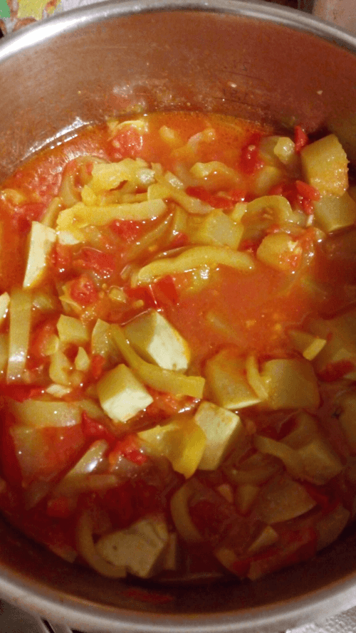 Wash the tomatoes, pour boiling water over them, and peel the skin. Cut them into strips along with the peeled pepper.