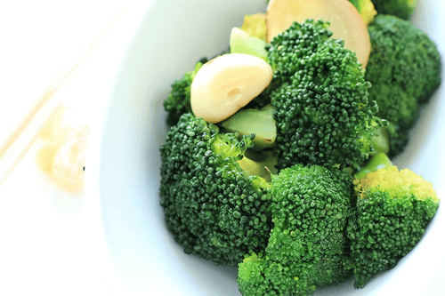Place the broccoli on a plate, squeeze the garlic pulp, and mix with lemon juice.