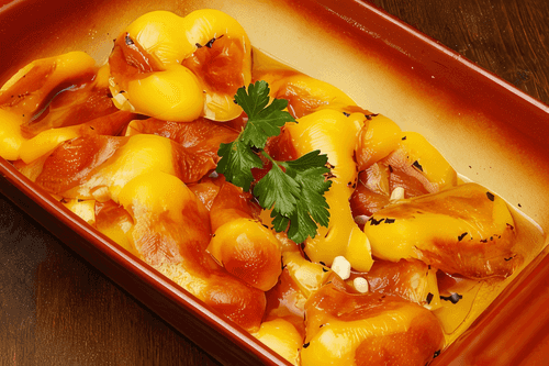 Marinated sweet peppers with lemon embody the taste of sunshine and Mediterranean freshness. The dish recalls traditional European marinades where simple ingredients transform into exquisite delights. Roasted until tender, the peppers gain a delicate sweetness, while the addition of lemon juice and zest gives them a light citrus tang. Oregano and garlic create a rich aroma, and olive oil makes the texture silky. This is an ideal appetizer or side dish that will enhance the table and complement meat and fish dishes.