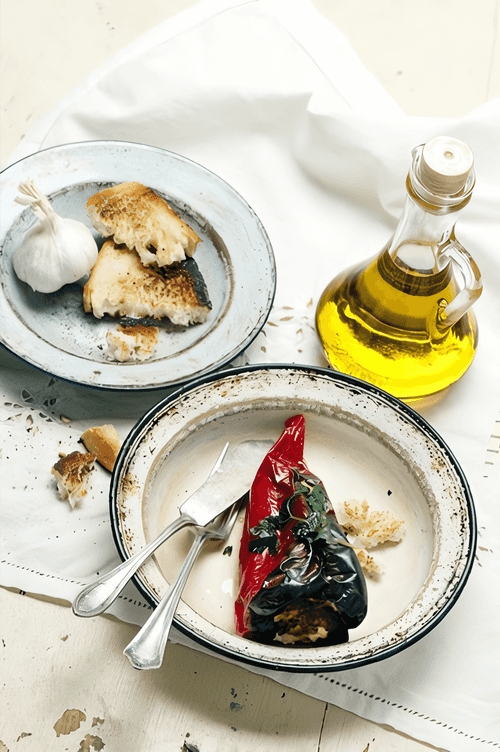 In a bowl, mix olive oil, vinegar, and minced garlic. Add salt and pepper. Drizzle over the peppers and let sit at room temperature for 1 hour.