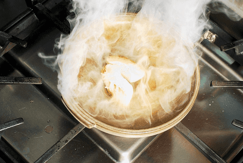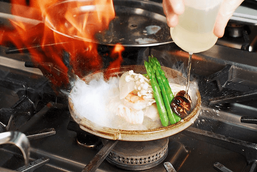 Pour sake into the toban, and a flame will immediately form in the hot vessel. Then add a pre-prepared mixture of soy sauce and yuzu juice in a 2:3 ratio. Exactly two seconds later, remove the toban from the heat.