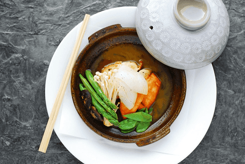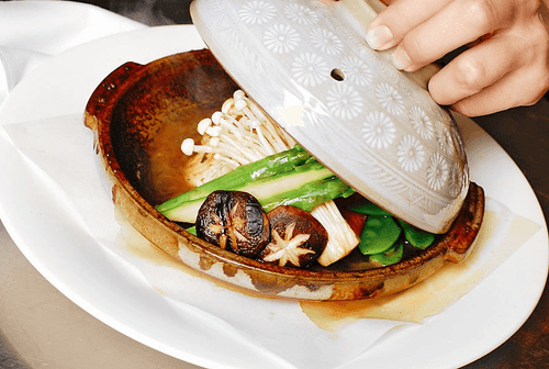 Let the dish sit covered for five seconds — the ceramic retains heat well. All ingredients are ready by the time the lid is removed. It should be eaten immediately, before the vegetables and seafood release their juices.