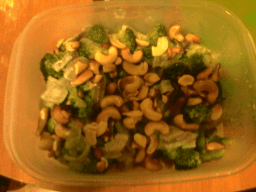 In a small pan, melt the remaining 15 g of butter, fry the cashews until they turn brown. Serve the broccoli hot, sprinkled with the fried nuts.