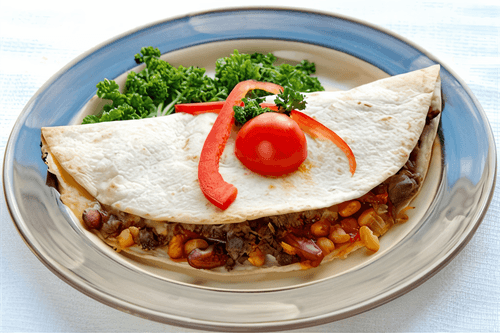 Place the tortilla on a heated skillet, add grated cheese to one half; cover the filling with the other half and flip for 2 minutes.