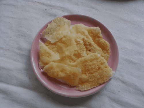 The cheese pieces should be the size of a chip. Place the pieces on a plate and put them in the microwave. There is no exact time, as the thickness depends on the time. Bring the cheese to a boil.
