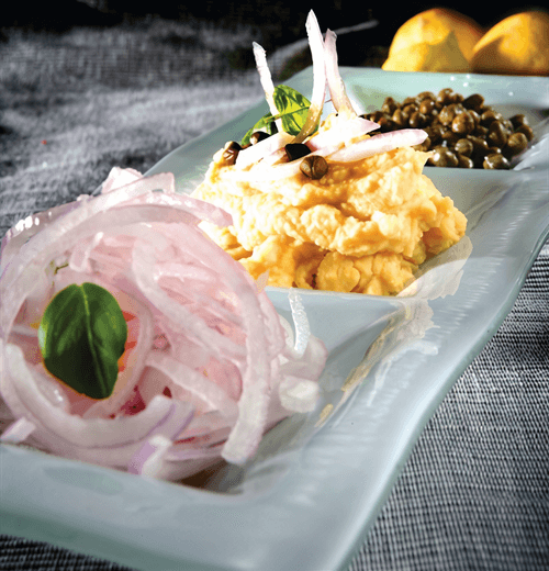 For the dressing, heat oil in a pan. Slice 3 onions into rings and fry with capers until golden. Add salt, mix, and add to the bean puree.