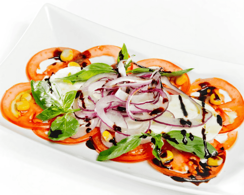 Carpaccio 'Caprese' with Unagrande mozzarella is an exquisite blend of Italian simplicity and refined taste. This recipe is inspired by the classic 'Caprese' salad but presented as carpaccio, where thin slices of fresh tomatoes are complemented by delicate, creamy mozzarella. Light notes of red onion add zest, while olive oil and balsamic vinegar create a harmonious balance of flavors. The dish is garnished with fresh basil leaves and corn kernels that add sweet accents. Carpaccio 'Caprese' is perfect for a light dinner, festive table, or summer picnic. Its freshness and vibrant flavors make it versatile, and the combination of ingredients offers true gastronomic delight.
