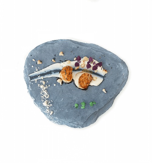 First, place the cauliflower puree, then the sautéed florets. Next, add the sea scallops. Drizzle with sauce made from duck bone broth and garnish with wasabi balls, watercress, and crumbled parmesan.