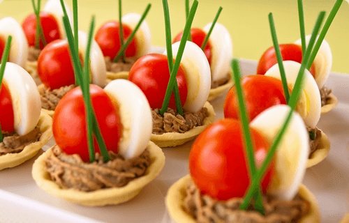 It is preferable to use small tartlets. Instead of cherry tomatoes, you can use regular tomatoes cut into small pieces, and instead of quail eggs, you can use chicken eggs.