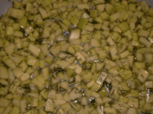 We cut the zucchini into medium cubes, crush the garlic, and chop the dill. We mix everything.