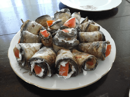 Cut the eggplants into long strips, dip in egg with salt, and fry in a pan with vegetable oil.