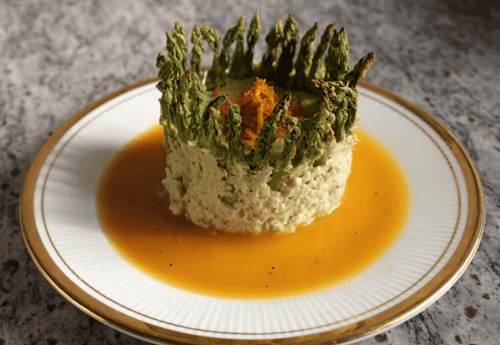 For the chicken and asparagus mousse, blend asparagus with raw chicken fillet, eggs, yolk, cream, and sour cream in a food processor. Add salt and pepper. Preheat the oven to 140 degrees. Grease four baking rings and distribute the mousse mixture among them. Arrange the tops of the asparagus stalks around the inner circle. Bake in a water bath for 20 minutes.