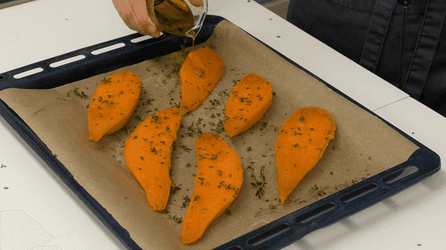 Peel the potatoes, boil them in salted water. Drizzle with some olive oil, sprinkle with thyme leaves, and place in an oven preheated to 180 degrees for 15 minutes.
