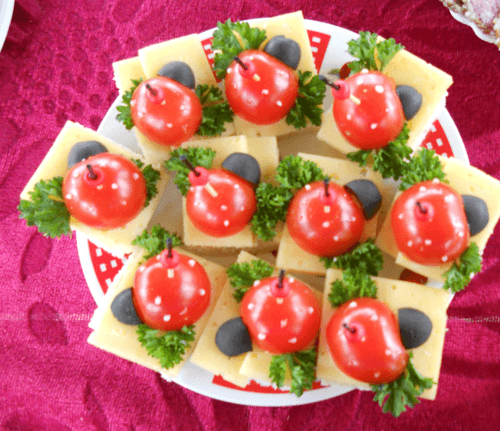 Cut the olives into 4 pieces - place 1 piece next to the tomato, resembling a ladybug's head.