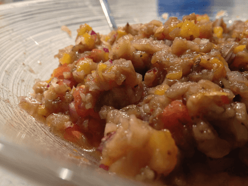 The next step is to chop everything very finely. Of course, it's preferable to use a knife and work by hand, but if there's no desire or time, a food processor can be used. In my opinion, the taste of the caviar suffers greatly from this.