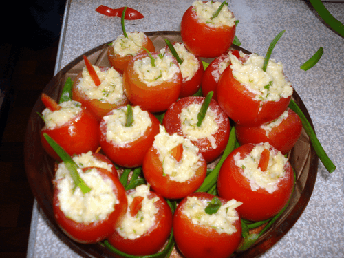 Fill the tomatoes with cheese mixture and place them on a serving dish.