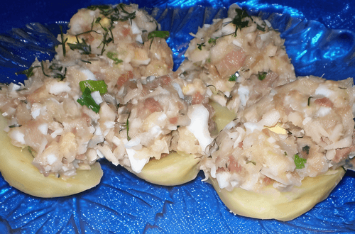 Combine everything in a deep dish, add fried onions, and mix well. You can season to taste with pepper and spices used for fish dishes. It stores well in the refrigerator.