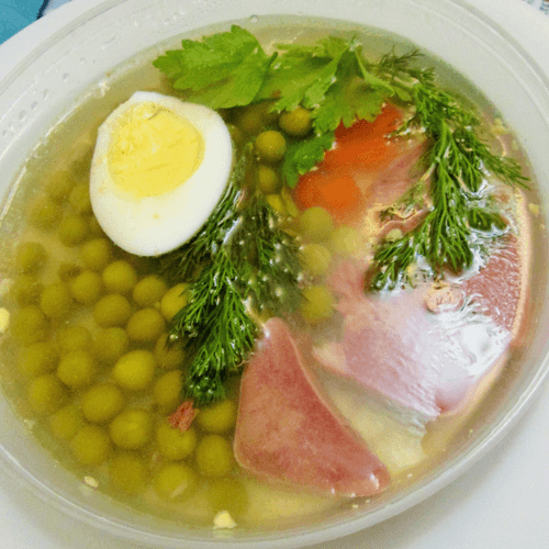 Prepare boiled eggs, boiled carrots, green canned peas, olives, onions, and herbs for serving.