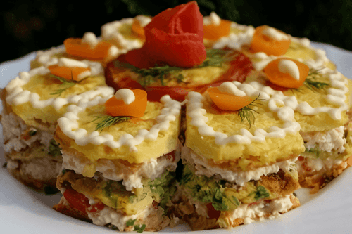 Portion-sized New Year's appetizer cake with cheese is an elegant and colorful dish inspired by Yugoslav cuisine. It consists of three differently colored omelets: yellow, red, and green, each adding its unique flavor note. The cream made from sweet pepper, cheese, and mayonnaise gives the dish a delicate texture and spiciness. Historically, such appetizers adorned festive tables in former Yugoslavia, symbolizing joy and abundance. Its original portioned presentation makes it convenient for buffets and gatherings, while the decorative arrangement of tomatoes, carrots, and greens gives it a refined festive look. This cake not only pleases the eye but also has a rich, balanced taste that combines creamy tenderness, cheesy richness, and a hint of spice. An ideal choice for New Year's celebrations!