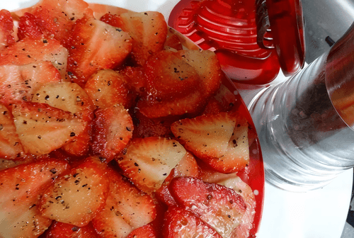 Slice the strawberries thinly. Arrange them beautifully on a plate, drizzle with balsamic and cognac, and sprinkle with freshly ground colorful pepper.