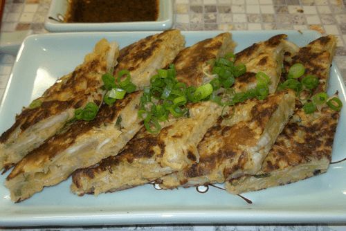 Place the pancakes on a cutting board, cut into diamonds, transfer to a plate, drizzle with sauce, and sprinkle with green onions on top.