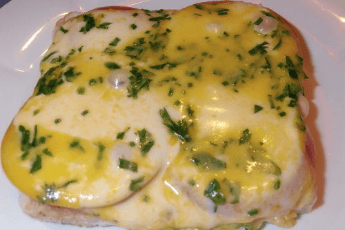Prepare a mixture of flour, egg yolks, nutmeg, parsley, salt, and white wine. Mix well. Spread over the cheese and bake in a hot oven (230 degrees) for a few minutes until the cheese melts.
