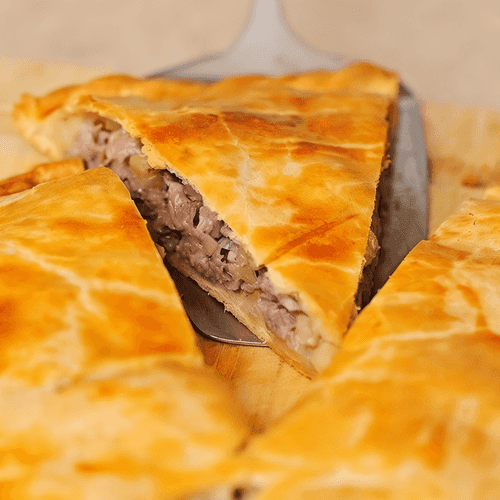 Meat pie in sour cream dough is a hearty and aromatic dish of Russian cuisine that evokes the comfort of home. Its roots trace back to the traditions of folk baking, where simple yet filling ingredients transform into a refined treat. The tender sour cream dough enriched with butter perfectly complements the juicy filling of lamb, potatoes, and onions seasoned with cumin and black pepper. Each slice of the pie reveals deep meaty notes, the softness of the dough, and a slight spiciness from the spices. Due to its richness and rich flavor, it is perfect for family lunches and warm gatherings. When cut open, the pie looks appetizing with its golden crust and aroma of fresh baking. It is not just a dish — it is part of cultural heritage embodying simplicity and culinary perfection.