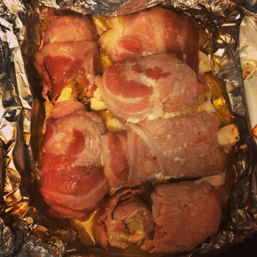 Chicken fillet rolls in bacon with feta cheese and tomatoes are an exquisite dish of Greek cuisine, embodying a harmony of flavors and textures. Tender chicken fillet infused with aromatic spices pairs with the tangy saltiness of feta and the sweet juiciness of tomatoes. The bacon wrapping the rolls adds a crispy crust and rich meaty flavor. Baked to perfection, they become soft inside but have an appetizing golden crust outside. This dish is perfect for a festive table or a cozy dinner, especially when paired with garlic sauce with dill. Greek traditions of love for fresh and natural products make these rolls a true gastronomic delight.