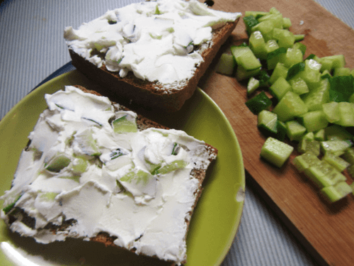 Bread toasts with celery, cucumber and cottage cheese salad