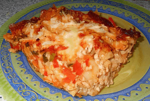We fill the pasta with sautéed vegetables. We take a deep baking dish, grease it with a little oil, then pour half of the béchamel sauce. We place the stuffed cannelloni. Then we pour the remaining béchamel sauce over it. We spread it over the entire surface of the pasta. And we pour tomato broth on top. We grate Adyghe cheese and Oltermanni cheese on top (it’s vegetarian, so both you and the animals are safe).
