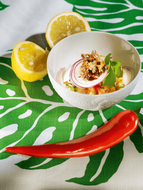 Mackerel and salmon ceviche is an exquisite dish rooted in Peruvian culinary traditions. It harmoniously combines the freshness of seafood with the spiciness of the marinade. The cold smoking of mackerel adds a rich aroma, while the tender salmon fillet balances the flavor with its softness. The secret to the dish's brightness lies in lime, which provides a refreshing tang, and cilantro that offers a light spiciness. Fried squid adds textural variety, while pickled red onion contributes a sweet note. This dish is perfect for both summer dinners and festive gatherings, awakening the appetite with its appealing appearance and rich taste.
