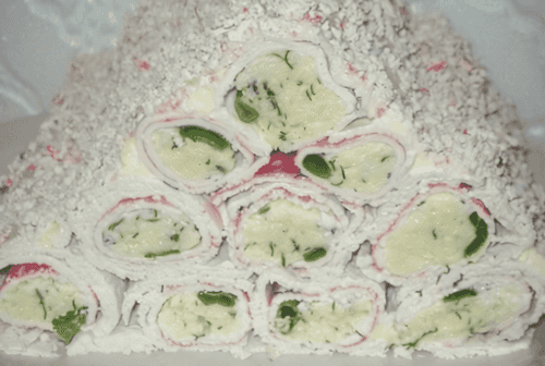 Spread mayonnaise on the sides of the entire log and grate the remaining two crab sticks on top. Chill the appetizer in the refrigerator for a few hours to make it easier to slice like a cake.