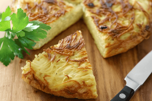 Patatnik with brinza is a traditional dish of Bulgarian cuisine originating from the Rhodope Mountains. Its roots go back to ancient times when shepherds prepared hearty and simple meals from available ingredients. The crispy golden crust of potatoes combines with the tender salty brinza, creating a unique taste that is both soft and rich. The addition of butter gives patatnik an appetizing texture and aroma. It is ideal for a cozy family dinner or as part of a festive table. In Bulgaria, it is often served with yogurt or fresh vegetables, highlighting its rustic simplicity and naturalness.