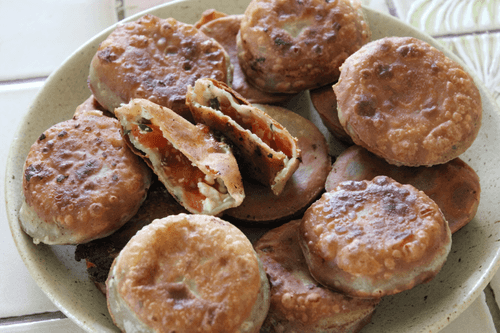 Divide the dough into two parts (one slightly larger than the other), roll both out quite thinly, place tomatoes on the smaller one (no closer than 3 cm apart), put a little filling on each circle (I sprinkled grated hard cheese on top — I had 'Comté'), cover with the larger half. Use a suitable diameter glass to cut out our tomato pies. And send them into oil in the pan. Serve hot.