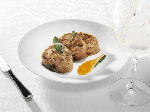 Galantin of guinea fowl, guinea fowl liver and porcini mushrooms