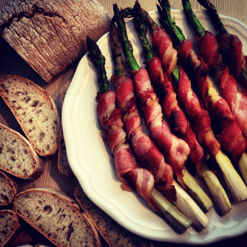 Wash the asparagus and trim the thick, tough ends. Wrap in bacon and place on a pre-greased baking sheet.