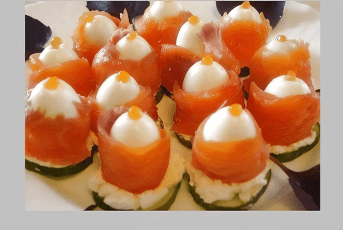 The appetizer of quail eggs and salmon is an exquisite masterpiece of European cuisine that enchants with its elegance and tenderness. It combines the creamy texture of cheese, the freshness of cucumber, the noble taste of red caviar, and the delicacy of quail eggs wrapped in thin slices of salmon. This dish is a true decoration for the festive table, evoking delight and appetite at first glance. The history of such appetizers goes back to the traditions of refined European techniques where harmony of flavors and aesthetics of presentation were valued. Each bite is a balance of salty fish notes, creamy cheese, and refreshing crunchiness of vegetables. Such an appetizer is perfect as an aperitif at dinner parties or as a sophisticated complement to sparkling wines, creating unforgettable gastronomic pleasure.