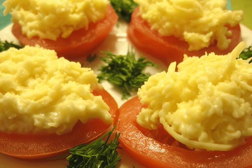 Tomato and cheese-garlic pâté sandwiches are a simple yet surprisingly delicious dish of European cuisine. Their roots can be found in the traditions of French and Italian appetizers, where cheese and fresh vegetables create a harmonious blend of flavors. The crispy toasted bread serves as an ideal base, complementing the juiciness of the tomatoes and the richness of the cheese-garlic pâté. This pâté, made from grated cheese, garlic, mayonnaise, and black pepper, adds spiciness and depth to the sandwiches. The dish is perfect for a quick snack or a festive table, impressing guests with its rich aroma and appetizing appearance. The finishing touch is fresh herbs that add freshness and an extra touch of sophistication to the sandwiches. An ideal combination of simplicity and gastronomic pleasure!