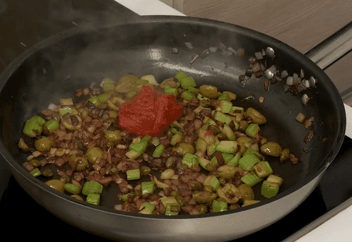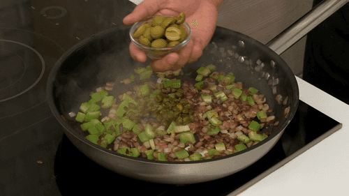 Add chopped celery, capers, and halved olives. Sauté, stirring, until the celery becomes translucent but still remains crunchy.