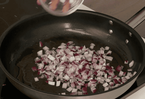 In the same pan, sauté the onion, cut to match the eggplant, until soft and golden.