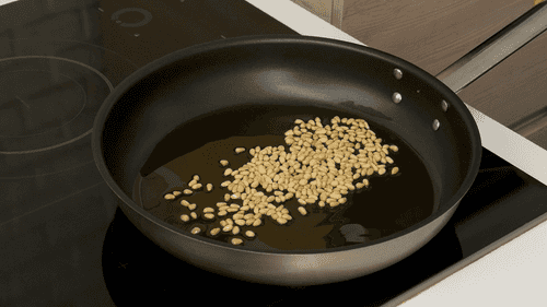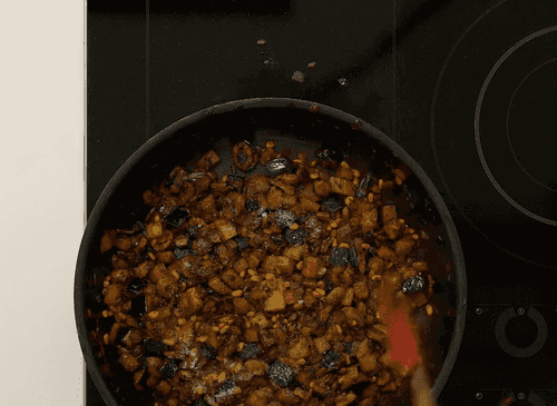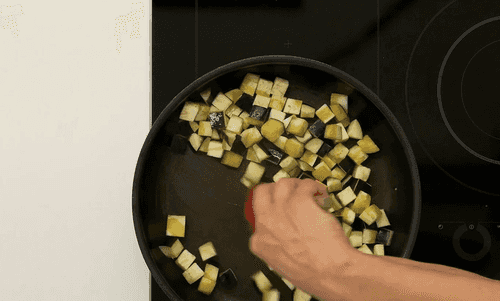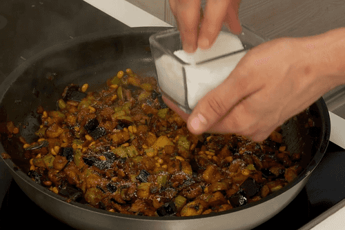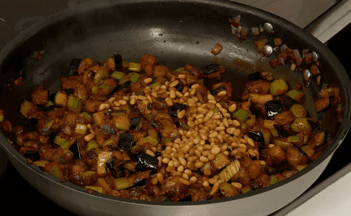 Fry for one to two minutes, then return the nuts and eggplants to the pan