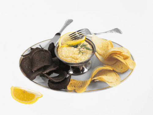 Carefully mix the caviar with mayonnaise (can be made homemade) and cream, add onion, and serve with bread chips, garnished with a slice of lemon and dill.