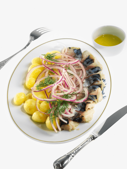 Cut the fish into slices about 2 cm thick, place on a plate with onions and potatoes, garnish with dill and serve.