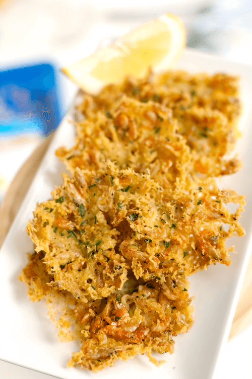 I placed the ready shrimp pancakes vertically on paper towels to let the excess oil drain off.