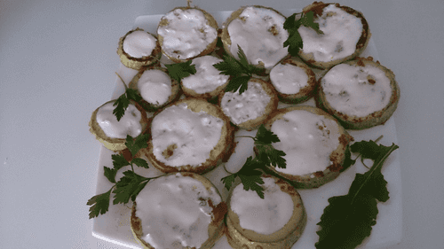 Place the fried zucchini on a plate and, while hot, coat with sour cream sauce.