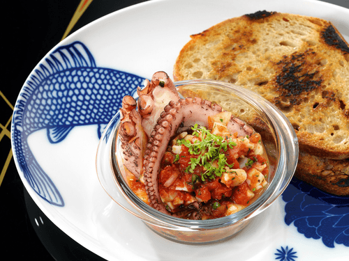Cut the squid and octopus into half-centimeter cubes and add to the salsa. Toast the bread in a small amount of olive oil.