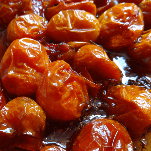 Tomatelli in spicy caramel with marinated mozzarella